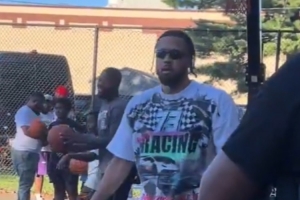 视频中,康宁汉姆戴着墨镜、身穿潮流T恤和卫裤以及一双运动鞋,连续试探步后背身单打抛投进筐。