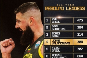 这样一来,他欧锦赛的总篮板数来到了309个,超越了小加索尔的307个,升至欧锦赛历史第4位。而前三位分别是:大加索尔的475个、诺维茨基的364个以及鲍里斯-迪奥的314个。