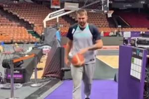 东契奇背着包准备离开训练场,他的斯洛文尼亚国家队队友阿伦-欧米奇表示,若东契奇能在通道里投进三分,他就做50个俯卧撑,东契奇背着包投进了三分。