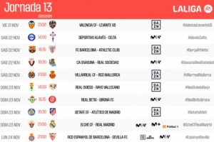 体育资讯10月20日讯 西甲官方公布第13轮比赛时间,11月22日23:15巴萨对阵毕巴,皇马24日4点出战。