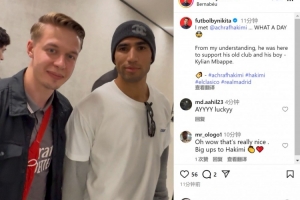 巴黎边卫阿什拉夫来到伯纳乌,观看了这场国家德比,见证老东家取胜,球迷社媒晒出与阿什拉夫的合照。